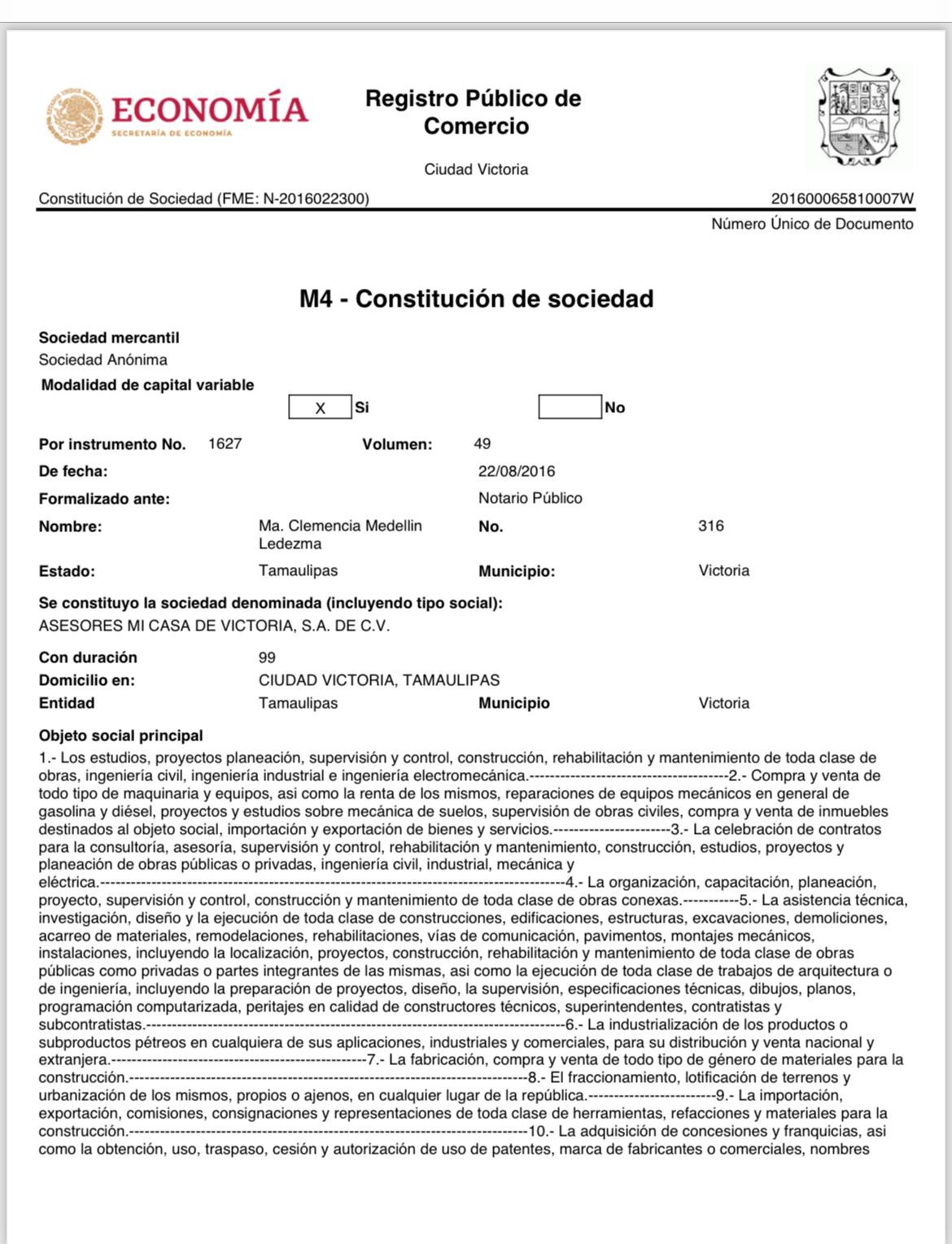 Según el Registro Público de Comercio de la Secretaría de Economía, Asesores Mi Casa de Victoria S.A. de C.V. tiene por objeto social la planeación, supervisión, control, construcción, rehabilitación y mantenimiento de obras de ingeniería civil o industrial, así como la compra y venta de maquinaria y materiales y la prestación de servicios de consultoría y asesoría técnica.