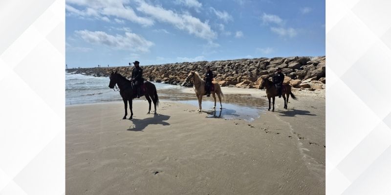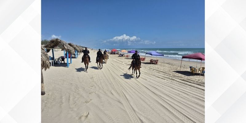 Soto la Marina, Tamaulipas.– En el marco del operativo Semana Santa 2026, caballos y jinetes del Agrupamiento Montado de la Guardia Estatal realizan labores de vigilancia y proximidad en la Playa La Pesca, ubicada en el municipio de Soto la Marina.