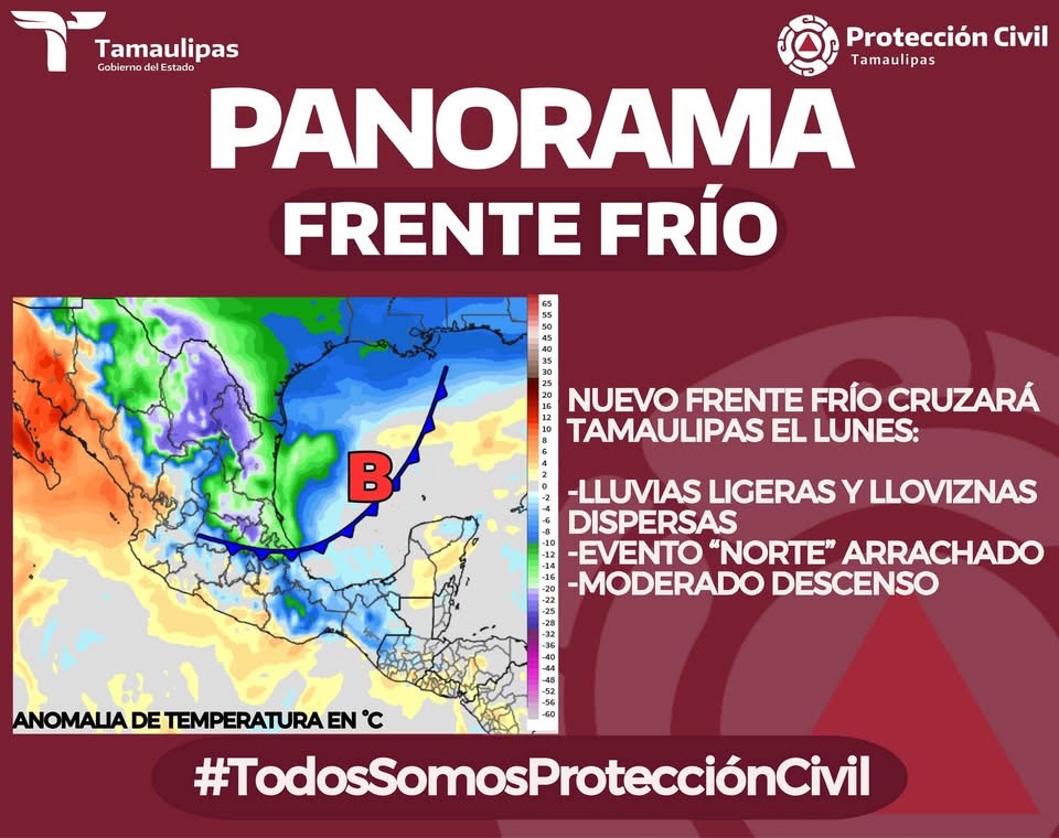 La Coordinación de Protección Civil señaló que durante este lunes, un nuevo frente frío cruzará Tamaulipas; lloviznas y lluvias ligeras dispersas, evento “Norte” con ráfagas de viento entre los 40 a 60 km/h y descenso moderado de temperaturas.