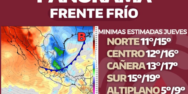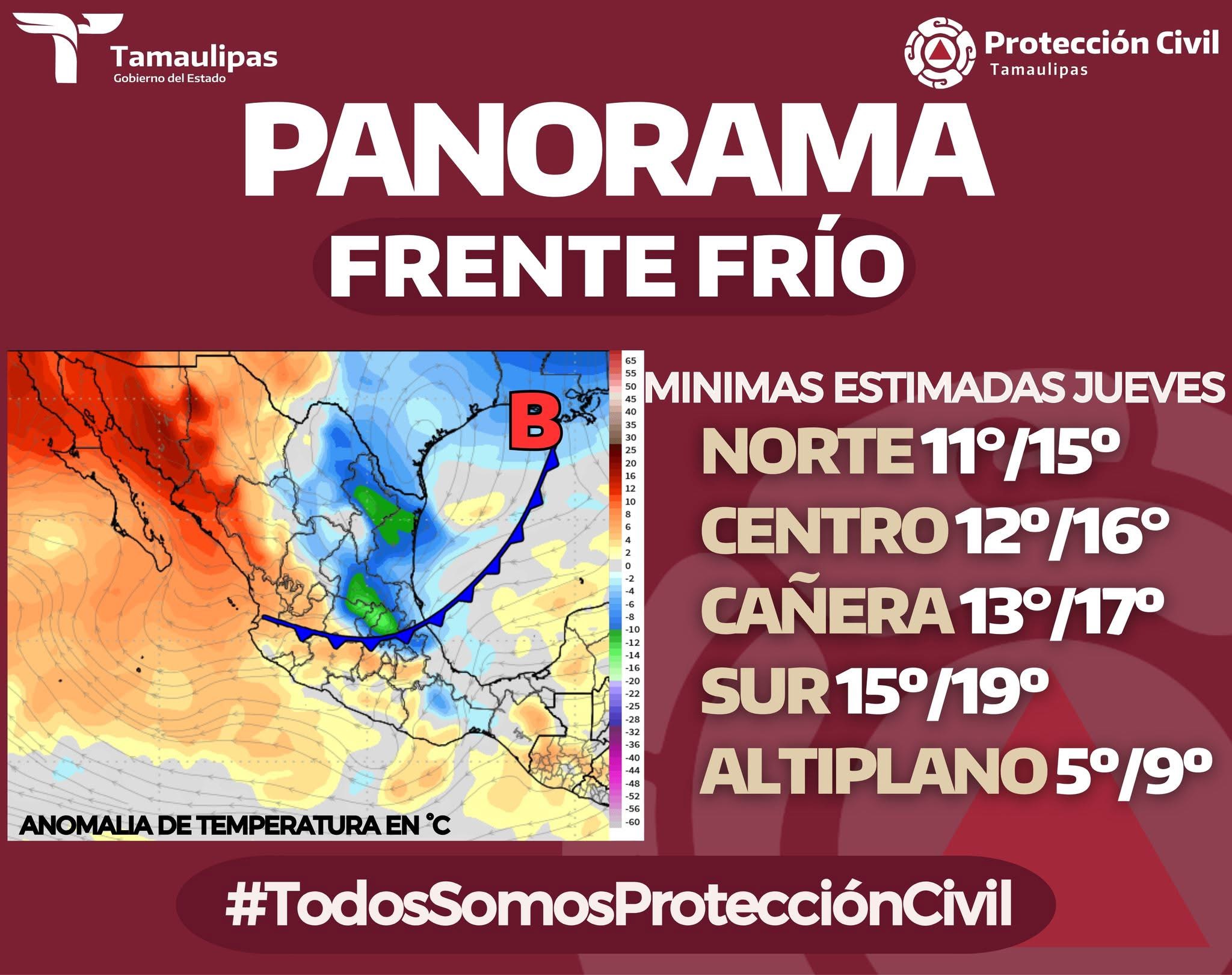 Un nuevo frente frío, cruzará Tamaulipas el miércoles; tormentas y chubascos dispersos, evento “Norte” con ráfagas de 40 a 60 km/h y un ligero descenso térmico.