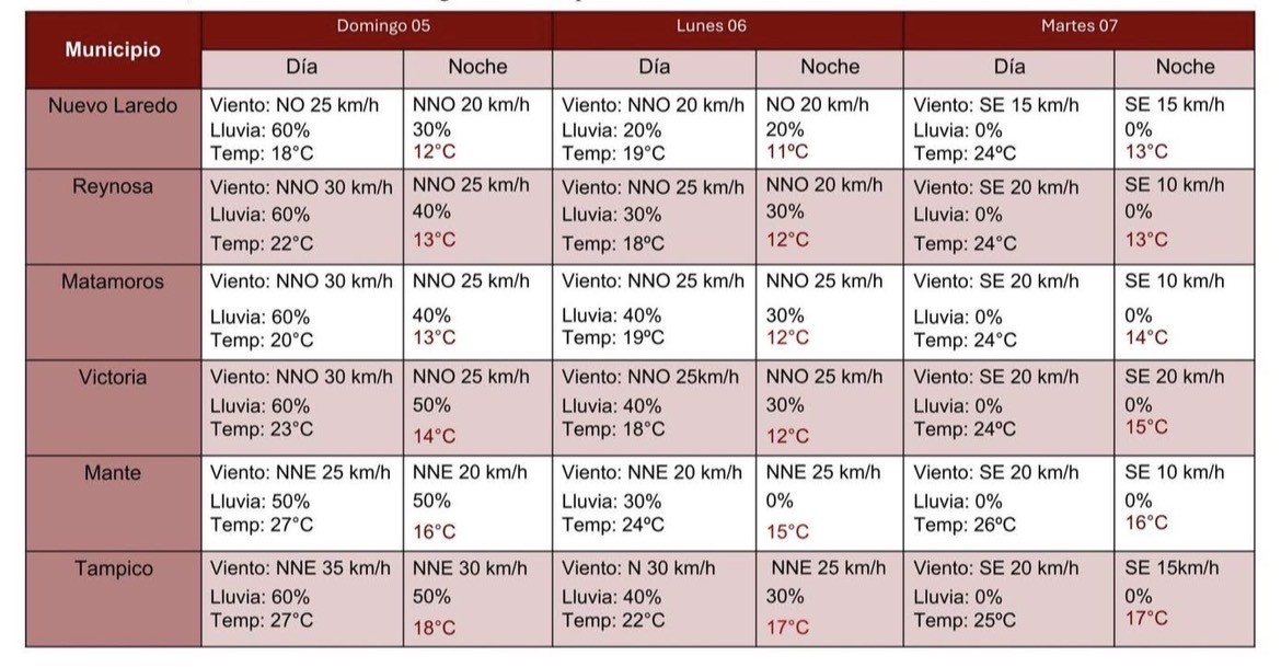 El frente frío No. 43, impulsado por aire polar débil, cruzará Tamaulipas durante el transcurso del domingo, generando probabilidad de tormentas y chubascos con lluvia fuerte, descargas eléctricas, caída de granizo con riesgo por inundaciones repentinas en zonas bajas, además de evento “Norte” con ráfagas de 35 a 55 km/h, y velocidades de 55 a 75 km/h en el Golfo de México con oleaje elevado de 2 a 4 metros, además de un ligero a moderado descenso térmico. Los efectos del aire ártico se