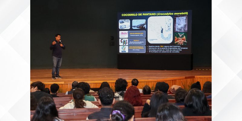 La conferencia estuvo a cargo del Dr. César Norberto Cedillo Leal, presidente nacional del Comité de Interacción Humano–Cocodrilo de México (Grupo SOS Cocodrilo) y coordinador nacional del Grupo de Interacción Humano–Cocodrilo para CONABIO–SEMARNAT, quien compartió resultados de investigación y experiencias de campo relacionadas con la conservación de cocodrilos, el monitoreo poblacional, la salud ambiental y el manejo responsable de las interacciones entre comunidades humanas y fauna silvestre.