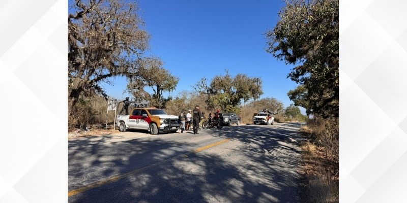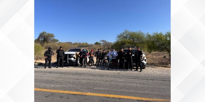 Tula, Tamaulipas.– Personal de la Guardia Estatal brinda apoyo de seguridad y resguardo perimetral durante la realización de la “Rodada x Tamaulipas”, encabezada por el ciclista de alto rendimiento César Vallejo Ledezma, en un recorrido efectuado sobre la carretera estatal 66, en el tramo Tula–Ocampo.