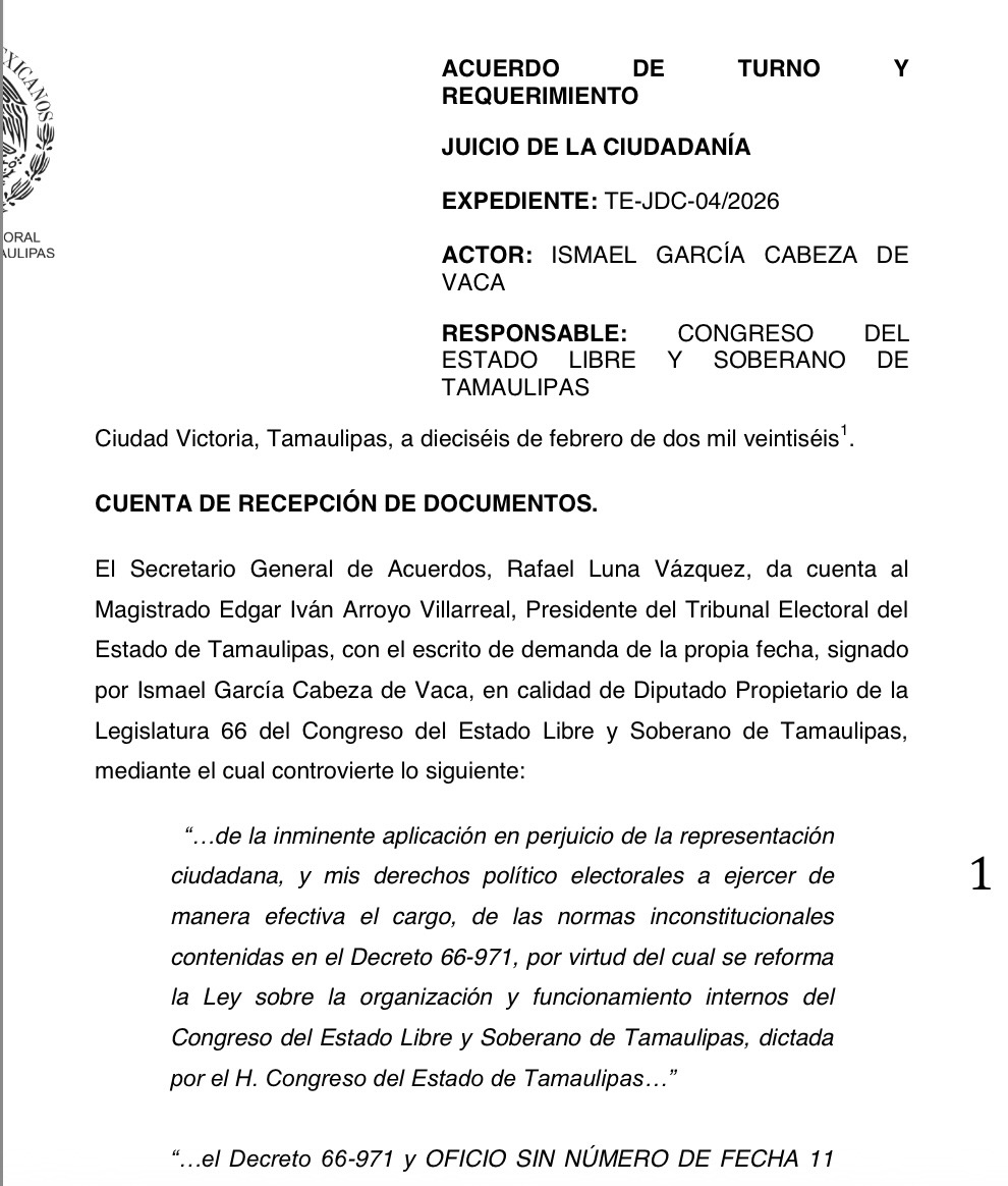 Ismael ahora promovió ante el Trieltam el Juicio de Ciudadanía TE-JDC-04/2026 donde alega que el decreto 66-971 contra la inasistencia de los diputados atenta contra sus derechos político-electorales.