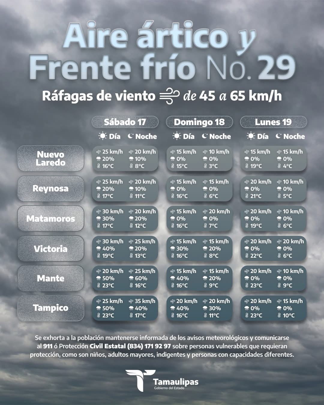 Ciudad Victoria, Tamaulipas.- La temperatura descenderá hasta los 2ºC este fin de semana por el ingreso del frente frío 29.
