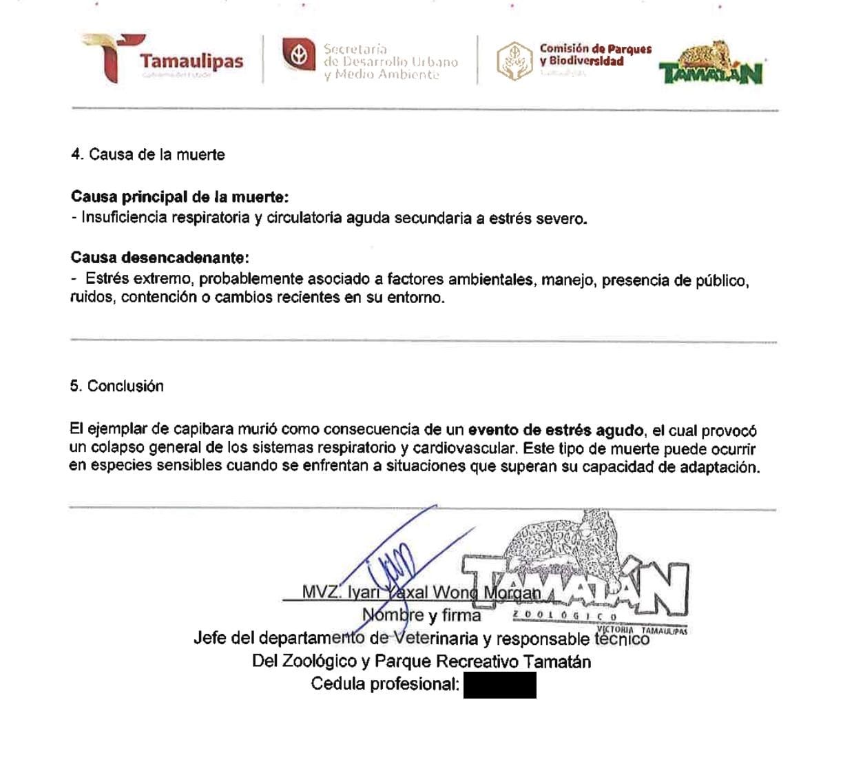 La causa principal de la muerte fue determinada como insuficiencia respiratoria y circulatoria aguda secundaria a estrés severo, teniendo como causa desencadenante un episodio de estrés extremo, probablemente asociado a factores ambientales, manejo, presencia de público, ruidos, contención o cambios recientes en su entorno.