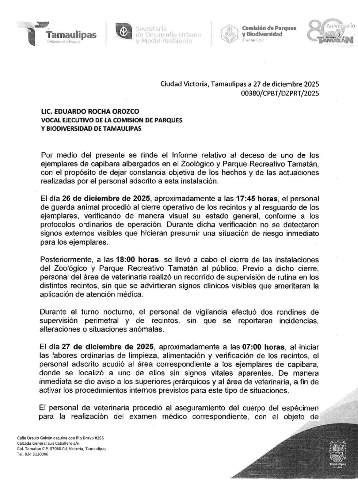 26 de diciembre de 2025 | 18:00 horas: Se cierran las instalaciones del Zoológico y Parque Recreativo Tamatán al público; personal de veterinaria efectúa un recorrido de supervisión de rutina sin hallar signos clínicos anormales.