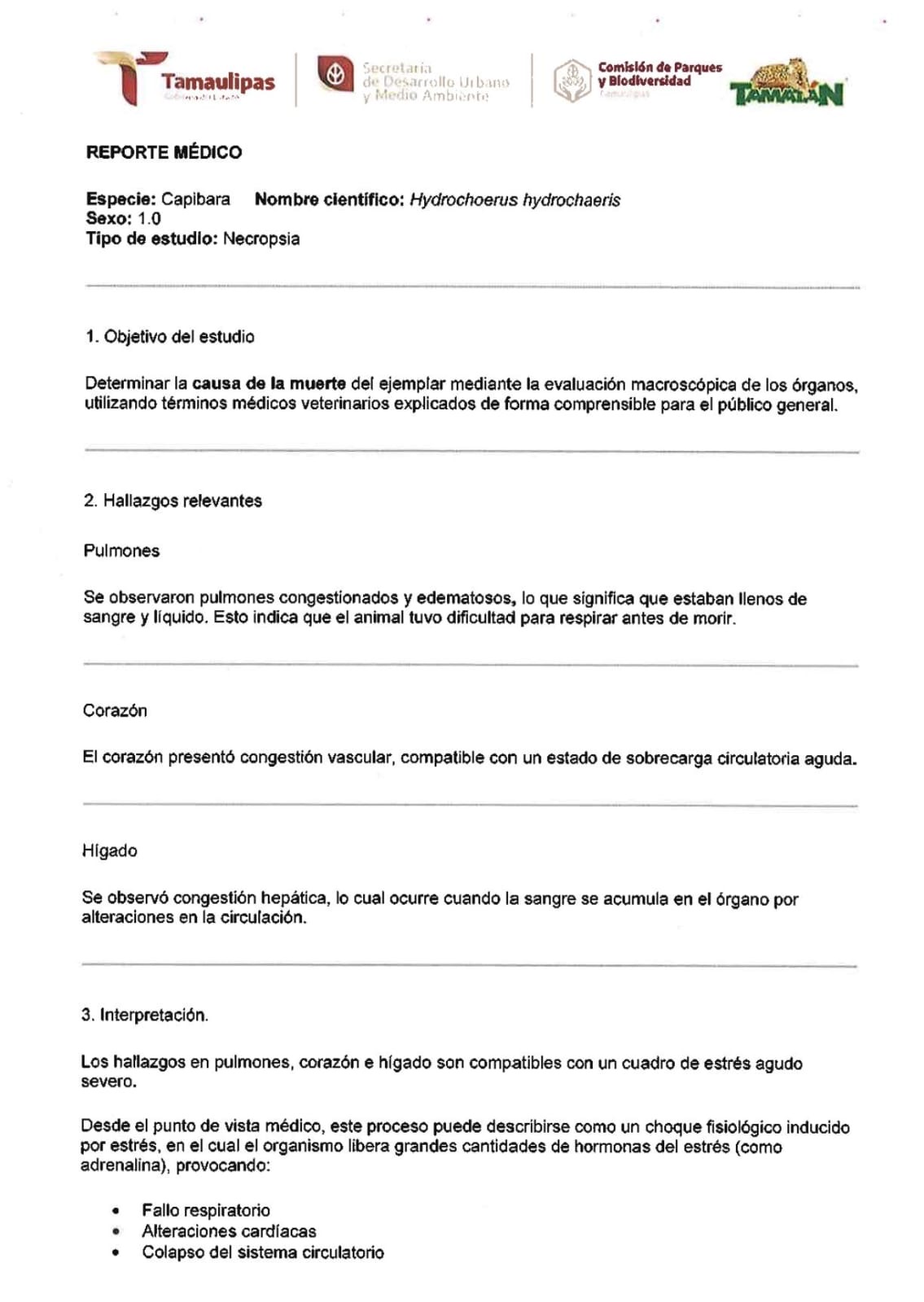El reporte médico veterinario, basado en una necropsia, detalla que los pulmones se encontraron congestionados y edematosos, es decir, llenos de sangre y líquido, lo que indica que el animal tuvo dificultad para respirar antes de morir.