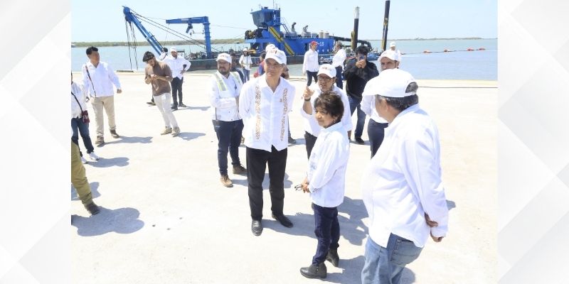 En la zona del muelle, supervisaron los trabajos que realiza la draga Montebello ADR-18, la cual cuenta con un tubo de 2 kilómetros de extensión, de 24 pulgadas de diámetro, con una capacidad de bombeo de 7 mil metros cúbicos por turno.