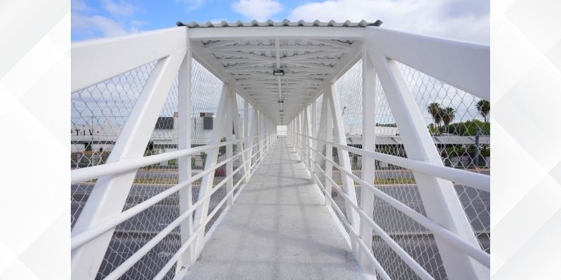 Este puente incluyó la instalación de columnas principales para soporte del piso, armazón metálico para el túnel, postes para elevar la altura de cables, lámina acanalada y losacero, además de pintura de esmalte, barandal metálico, malla de protección, guarniciones, banquetas y sistema de alumbrado.