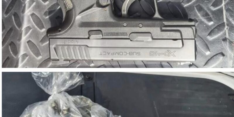 Durante la revisión correspondiente, se localizó en el interior del vehículo un arma de fuego corta, así como hierba verde con características propias de la marihuana.