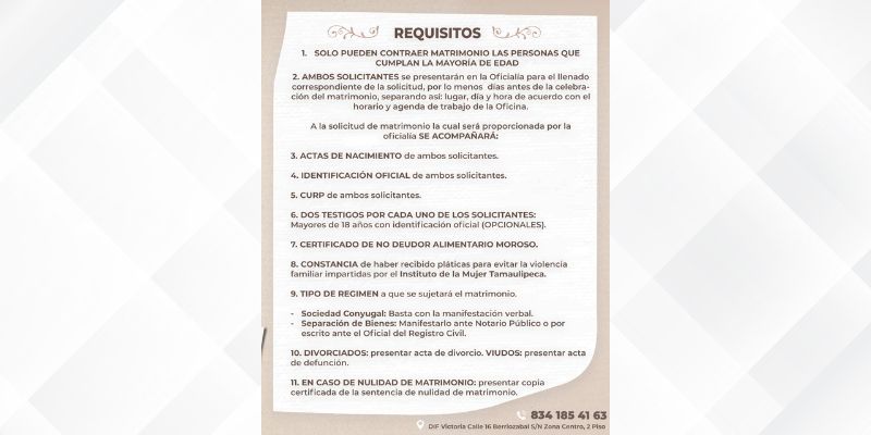 Para mayores informes, las personas interesadas pueden acudir directamente a la Procuraduría ubicada en el segundo piso del edificio DIF Victoria en el 16 Berriozabal en un horario de 8:00 am a 2:30 pm o comunicarse a los teléfonos (834) 185 41 63 y (834) 185 41 60