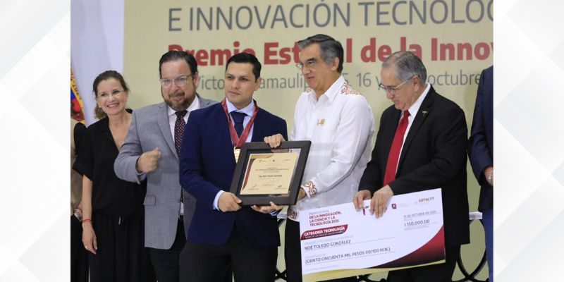 El gobernador Américo Villarreal Anaya hizo entrega de la Medalla “Ramiro Iglesias Leal” al ganador del Premio Estatal de la Innovación, la Ciencia y la Tecnología 2025 en la categoría de Innovación, el Dr. Edgar Tello Leal de la Facultad de Ingeniería y Ciencias de la Universidad Autónoma de Tamaulipas; de la Medalla “Ruy Pérez Tamayo”, al ganador en la categoría de Ciencia, el Dr. Gaspar Manuel Parra Bracamonte del Centro de Biotecnología Genómica del Instituto Politécnico Nacional, y en la categoría de Tecnología, la Medalla “María de los Ángeles Valdés Ramírez”, al Dr. Noé Toledo González de la Universidad Tecnológica de Matamoros.