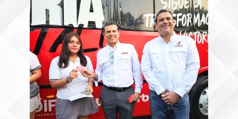 Cd. Victoria, 22 de abril de 2026.- El alcalde de Victoria Eduardo Gattás Báez, entregó las primeras tarjetas de transporte escolar, de las 2 mil que serán distribuidas a través del Programa Lalobús, para el traslado gratuito de estudiantes a instituciones de nivel medio superior.