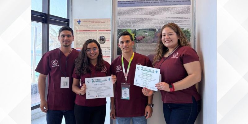 Miguel Nava, Karyme Ariciaga, Rossmy Cruz y Guillermo Delgado Hernández, adscritos a la Facultad de Medicina Veterinaria y Zootecnia, representaron con orgullo a la UAT mediante la exposición científica de sus proyectos de investigación, asesorados por su profesor, el MVZ Ned Iván de la Cruz.