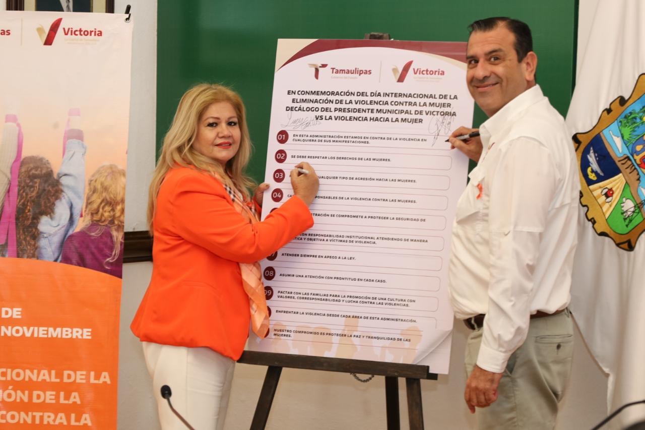 Cd. Victoria, 25 de noviembre 2025. – Con la presencia de la presidenta del Sistema DIF, Lucy de Gattás, el alcalde de Victoria Eduardo Gattás Báez firmó, junto a integrantes del Gabinete Municipal, el decálogo contra la violencia hacia la mujer para dar paso firme hacia un futuro libre de violencia de género.