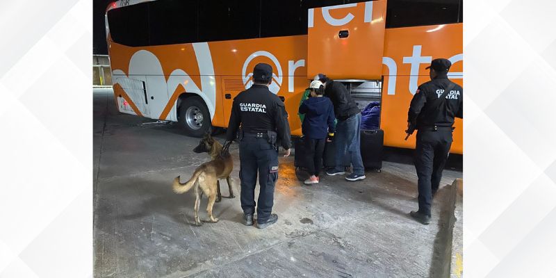 Guardia Estatal refuerza vigilancia con binomios caninos en la Central de Autobuses de Victoria