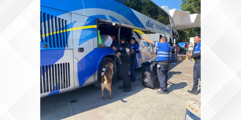 Durante la intervención, el canino “Looky” realiza barridos preventivos en pasillos, sala de espera, andenes, áreas comunes y la zona de paquetería, además de la inspección de maletas y autobuses de distintas líneas de transporte foráneo.