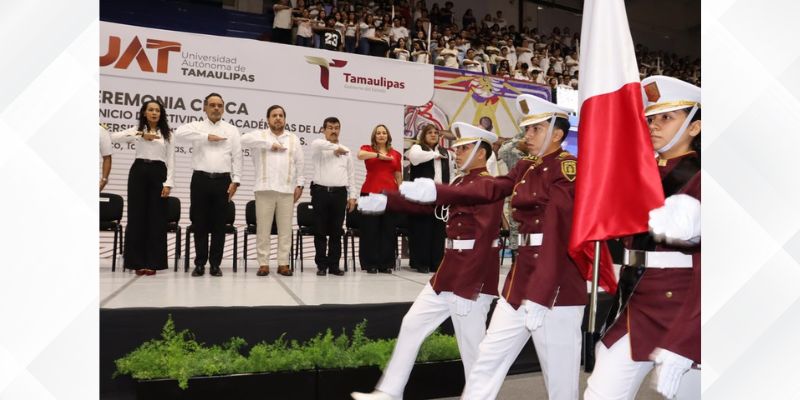 Con la presencia del secretario de Educación de Tamaulipas, Miguel Ángel Valdez García, representante del gobernador Américo Villarreal Anaya, el rector de la UAT puso en marcha el período escolar universitario en donde expresó su mensaje de bienvenida a la comunidad estudiantil, teniendo como marco los honores a los símbolos patrios.