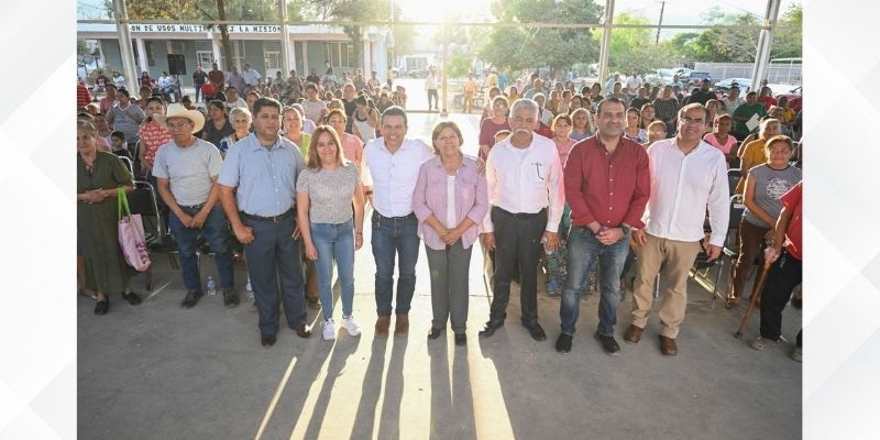 Junto a 250 familias, el presidente ejidal Mario Maldonado y María Turrubiates como beneficiaria, dieron cordial bienvenida a la comitiva integrada por el secretario del Ayuntamiento Hugo Reséndez Silva y personal de la Secretaría de Desarrollo Rural.