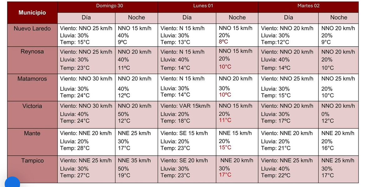 El frente frío No. 17, impulsado por aire ártico, cruzará Tamaulipas mañana domingo, generando un evento “Norte” con ráfagas de 40 a 60 km/h, además de un ligero a moderado descenso térmico dependiendo de la zona. Sus efectos serán más notorios en la zona Norte y Centro. Asimismo, se prevén lluvias dispersas con eventos localmente moderados, especialmente durante el paso del sistema frontal. Predominarán periodos de cielo nublado a parcialmente nublado, con ambiente frío por las mañanas y templado a fresco durante las tardes.