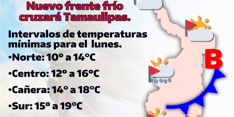 La Coordinación de Protección Civil advirtió del frente frío No. 12 que cruzará Tamaulipas durante la madrugada y mañana del domingo, ocasionando un descenso térmico ligero pero perceptible.