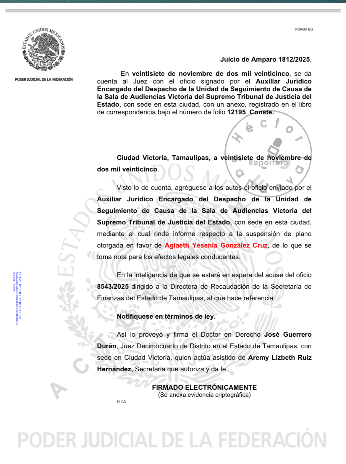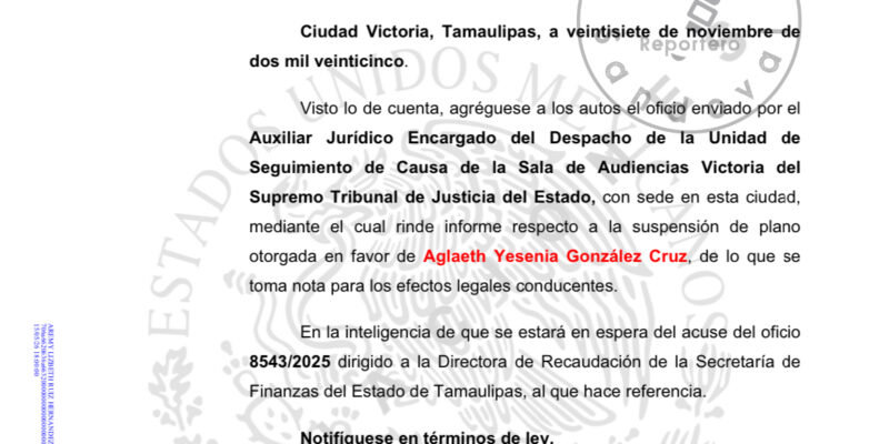 Ciudad Victoria, Tamaulipas.- La multa de 1.3 millones de pesos impuesta por una jueza en contra de la abogada Aglaeth Yesenia González Cruz quedó suspendida temporalmente, luego de que un juez federal ordenara detener su ejecución mientras se resuelve el juicio de amparo promovido por la abogada.