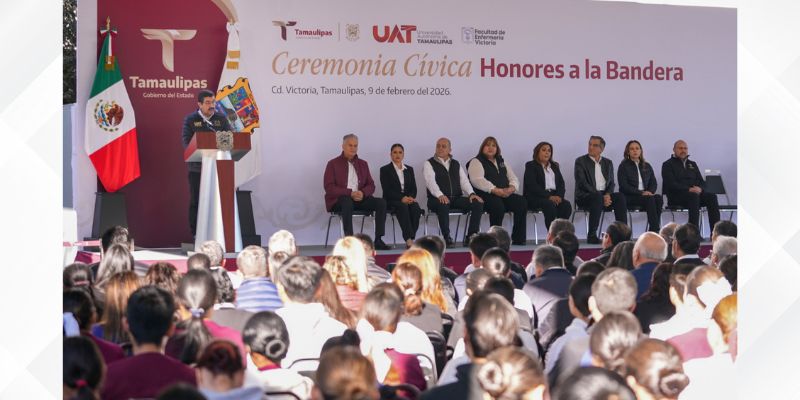 El gobernador Américo Villarreal Anaya, junto con el rector de la Universidad Autónoma de Tamaulipas (UAT), Dámaso Anaya Alvarado, encabezó este lunes la ceremonia de honores a la bandera y atestiguó la toma de protesta de la Dra. María Guadalupe Vázquez Salazar como directora de la Facultad de Enfermería Victoria para el periodo 2026-2029.