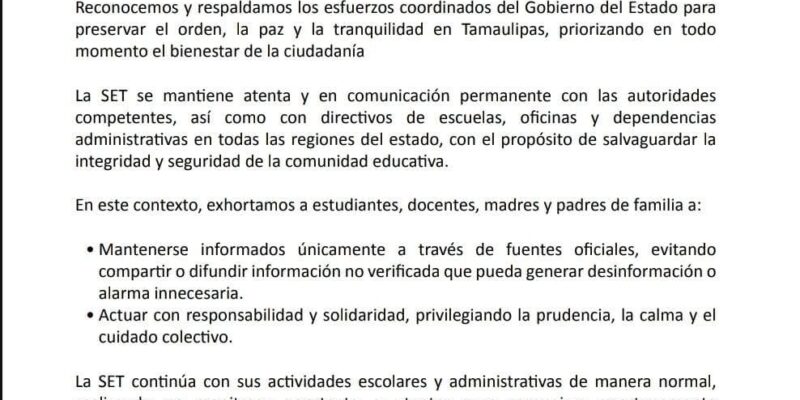 Ciudad Victoria, Tamaulipas.- La Secretaría de Educación de Tamaulipas (SET) informó que no se suspenden las clases presenciales en la frontera y resto de la entidad.