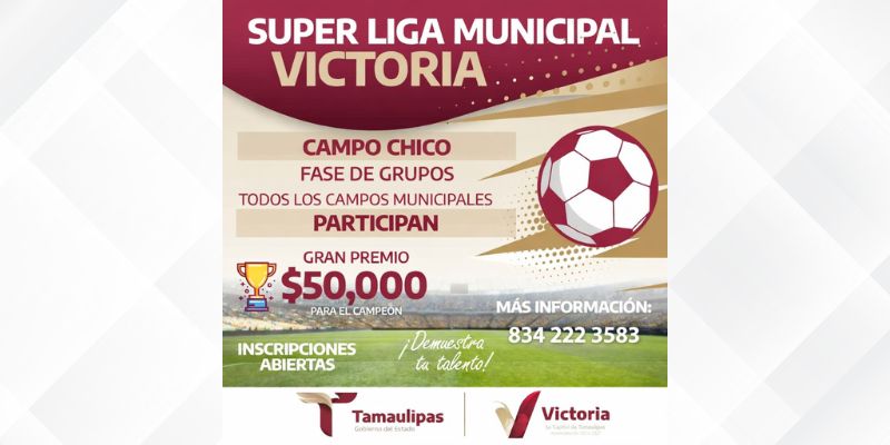 Cd. Victoria, 24 de enero de 2026. – A partir de febrero y con una bolsa de 50 mil pesos en premios, el Gobierno de Victoria de Eduardo Gattás Báez, pondrá en marcha la Súper Liga de Fútbol 7, 8 ó 9, según las dimensiones de los campos administrados por el Municipio, a través del Departamento del Deporte y la Juventud.
