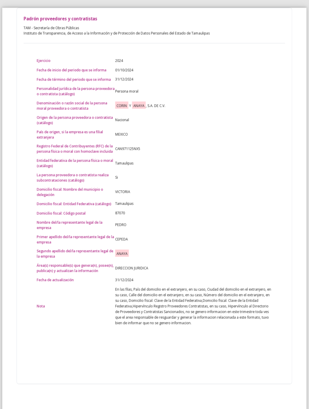 El propio lineamiento federal prohíbe expresamente recibir propuestas o celebrar contratos con compañías en esta condición, pero en Tamaulipas no se ha eliminado a Corin y Anaya del registro estatal.