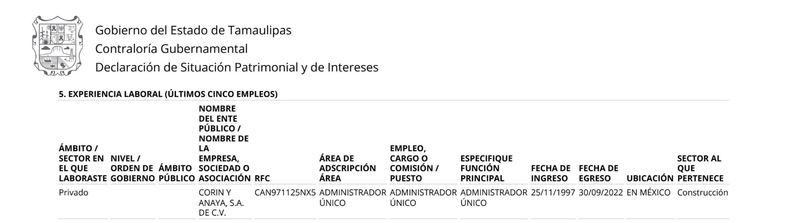 En su declaración patrimonial, el funcionario reconoce que desde 1997 se ostenta como administrador único de Corin y Anaya, S.A. de C.V.
