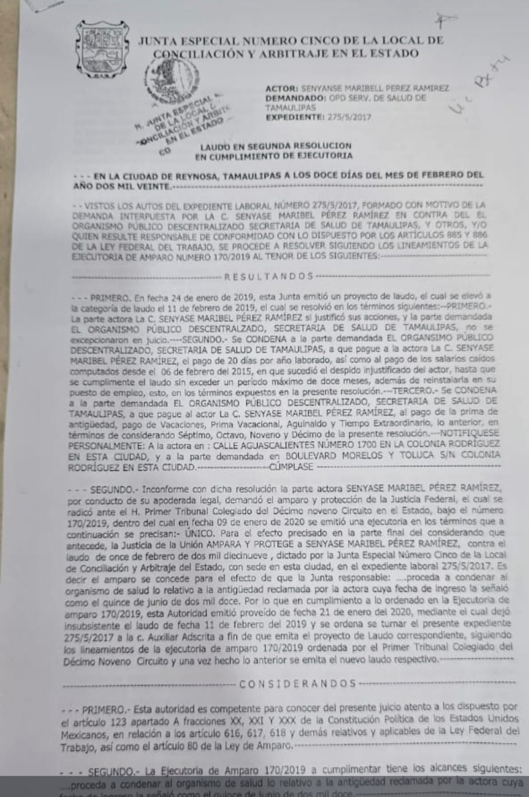 El 23 de febrero de 2026, la Secretaría de Gobernación emitió un oficio dirigido a la Procuraduría de la Defensa del Trabajo en Tamaulipas, en el que se reconoce la existencia de un laudo firme, la reinstalación de la trabajadora y la falta de pago de salarios.