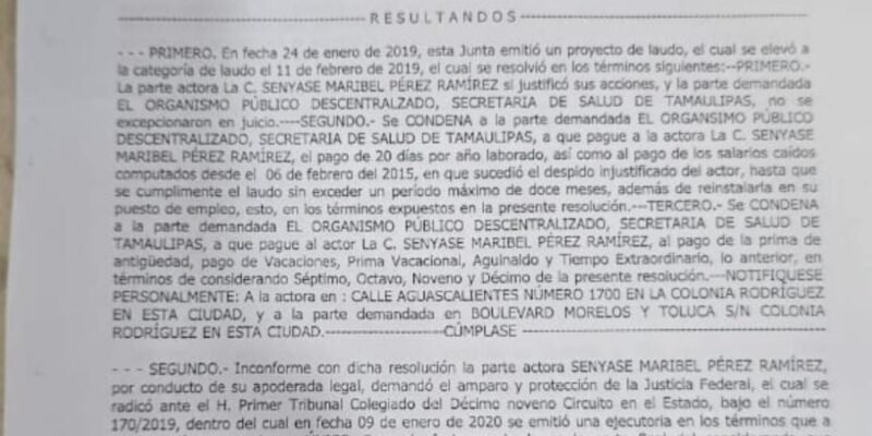 Ciudad Victoria, Tamaulipas.– La nutrióloga Senyase Maribell Pérez Ramírez acumula 36 quincenas sin recibir salario, a pesar de contar con un laudo laboral que ordenó su reinstalación y el pago de salarios caídos tras haber sido despedida en 2017.