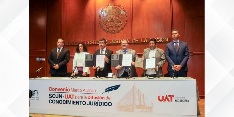 La Universidad Autónoma de Tamaulipas (UAT) y la Suprema Corte de Justicia de la Nación (SCJN) suscribieron el Convenio Marco Alianza SCJN–UAT para la Difusión del Conocimiento Jurídico, así como un convenio específico en materia de servicio social.