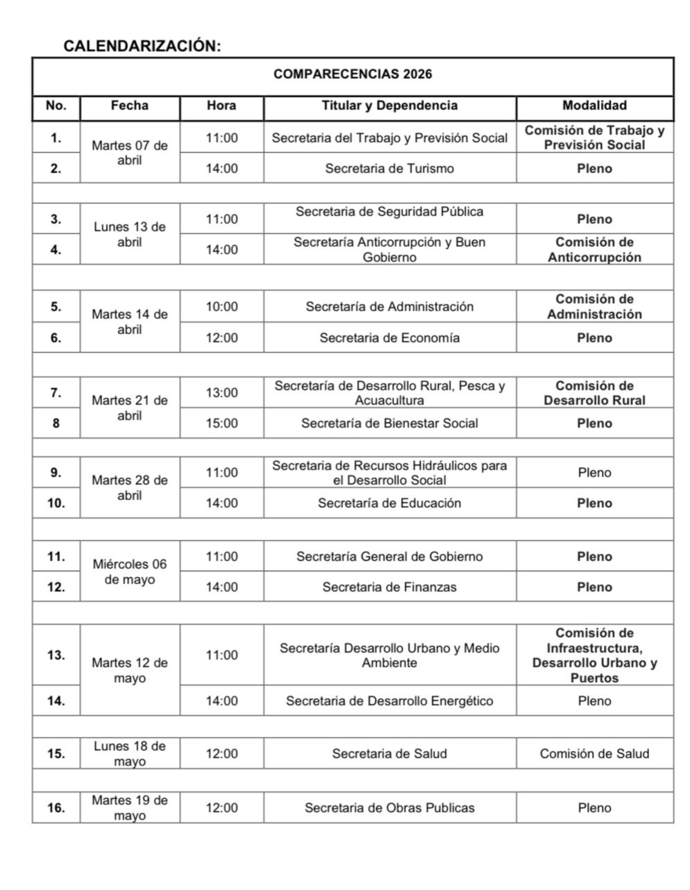 Asimismo, dio a conocer que, a solicitud del titular del Poder Ejecutivo, se incorporaron al calendario las comparecencias de la Secretaria de Salud y del Secretario de Desarrollo Urbano y Medio Ambiente, de reciente ingreso.